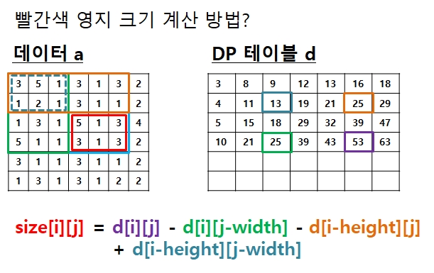 - DP 테이블을 이용해 면적을 계산한다.